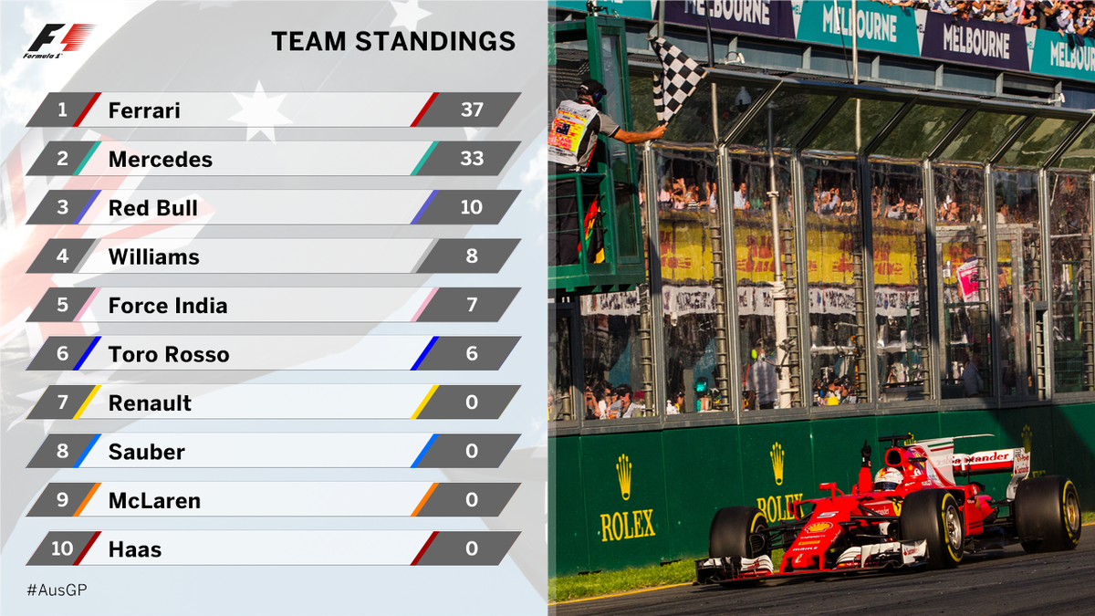 Prvu trku sezone obilježila je sjajna vožnja Vettela, ali i velika taktička pogreška vodstva Mercedesa, koje je pozvalo Hamiltona, koji je vodio utrku od starta, u boks puno ranije od suparnika. Nakon izmjene guma, Hamilton je upao u gužvu na stazi, što je otvorilo vrata Vettelu ka pobjedi.